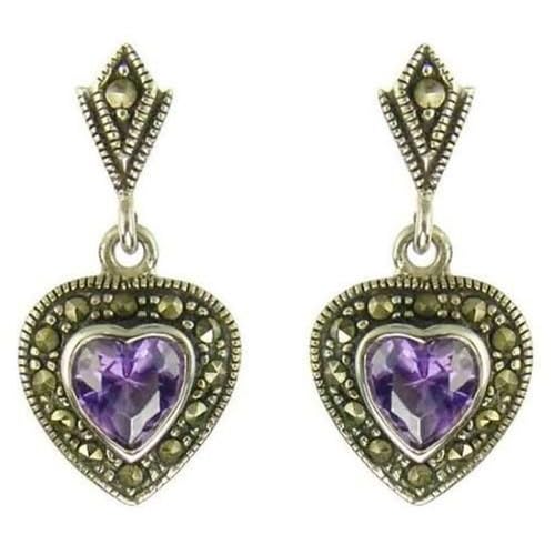 Silver Ladies Marcasite Amethyst Heart Earrings